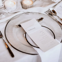 Unsere Platzteller aus Glas mit schwarzem Tellerrand verleihen eurer Festtafel einen eleganten Touch. Ein perfekter Match mit Goldbesteck und goldenen Servierttenringen.