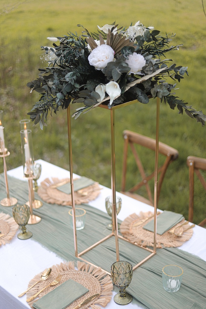 Unser Vasengestell in Gold kann auf Eckigen und Runden Tischen platz finden. Die Gestelle sind ein Hingucker in eurer Location oder als zwei Säulen im Eingangsbereich. Oben auf dem Gestell ist eine abnehmbare Platte die man individuell mit Blumen dekorieren kann. Maße Höhe 80cm Breite 28 cm